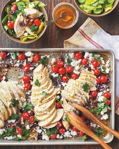 Today we have a recipe for Warm Greek Chicken Salad from the new book Sheet Pan Everything by Ricardo Larrivee, an easy mix of chicken, olives, red onions, feta, and parsley served over greens. Am considering making this slightly heartier by swapping the greens for pasta—TikTok pasta WHO?—with the greens on the side. TBD! Either way, sounds like dinner tonight to me.
